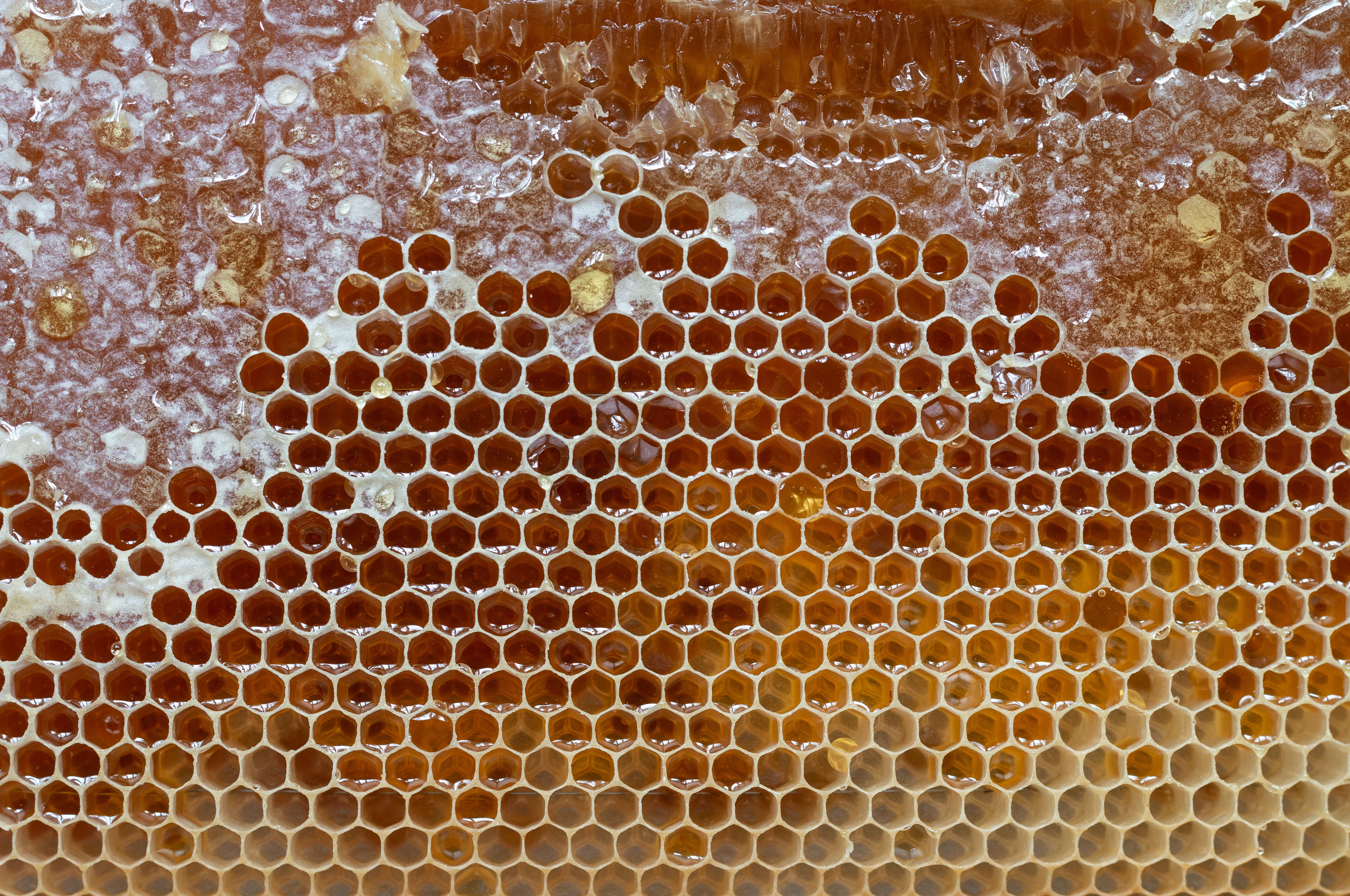Honey starts as flower nectar collected by bees, which gets broken down into simple sugars stored inside the honeycomb